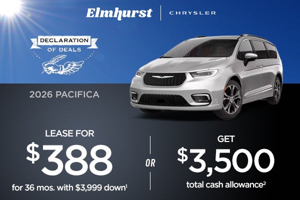 1. A low-mileage lease for well-qualified lessees. Based on MSRP example of $45,940 with 27L package after all applicable offers and a $595 acquisition fee. Total due at lease signing includes a down payment and first month's payment. Offer requires dealer contribution. Tax, title & license extra. Lessee is solely responsible for early lease termination payments, fees, costs, penalties, excess wear and tear and mileage of $0.30/mile for each mile over 10,000 miles per year, if vehicle is returned at end of term. $395 disposition fee due at lease end. Dealer's actual terms may vary. Offer through Stellantis Financial Services. Residency restrictions apply. Contact dealer for details. Must take delivery by 04/30/2026. 2. Offer excludes Pacifica Phev Pinnacle & Pacifica Phev Select. Offer valid towards purchase of new or unused vehicle. Contact dealer for details. Take retail delivery by 04/30/2026.