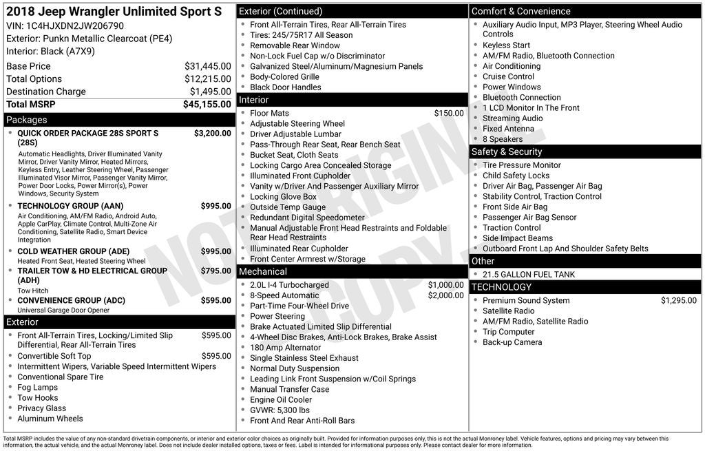 This Wrangler Unlimited Sport S is equipped with a long list of impressive features that will elevate your driving experience. The Uconnect 4 infotainment system with 7-inch touchscreen provides seamless smartphone integration, while the premium Alpine audio system delivers exceptional sound quality. Stay cozy in cold weather with the heated steering wheel and front seats, and enjoy the convenience of remote keyless entry and a universal garage door opener.