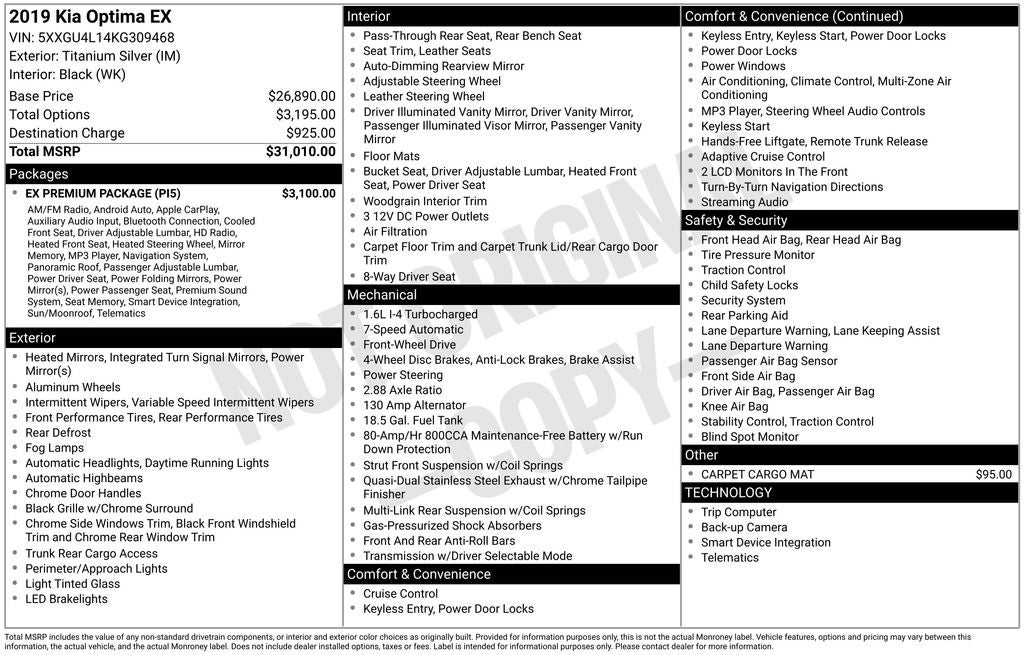 Experience the difference with this exceptional 2019 Kia Optima EX Turbo. Schedule a test drive today and discover how this sedan can elevate your daily commute and weekend adventures. We're confident you'll be impressed by the Optima's exceptional value, style, and performance.