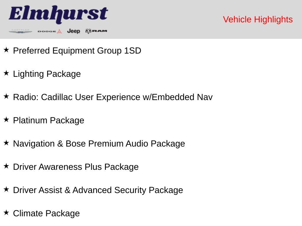 8 Diagonal Color Reconfigurable DIC Display, Advanced Adaptive Cruise Control, Air Ionizer, Alloy Pedals, Automatic Emergency Braking, Automatic Heated Steering Wheel, Automatic Parking Assist w/Braking, Automatic Seat Belt Tightening, Body-Color Heated Power-Adjustable Outside Mirrors, Body-Color Heated Pwr-Adjustable Outside Mirrors, Bose Performance Series Premium 15-Speaker System, Climate Package, Door Lock & Latch Shields, Driver Assist & Advanced Security Package, Driver Awareness Plus Package, Driver Manual Cushion Length Adjustment Seat, Driver Power Lumbar Massage Seat, Driver Power Seatback Bolster Adjustment, Dual Diagonal Color Driver Information Center, Enhanced Automatic Emergency Braking, Following Distance Indicator, Front Cornering Lamps, Front Passenger Manual Cushion Length Adjustment, Front Passenger Power Lumbar Massage Seat, Front Passenger Power Seatback Bolster Adjustment, Hands-Free Decklid Release, HD Rear Vision Camera, HD Surround Vision, Head-Up Display, Heated Driver & Front Passenger Seats, Illuminating Front Sill Plates, Inside Rear-View Auto-Dimming Mirror, IntelliBeam Automatic High Beam On/Off, Lane Keep Assist w/Lane Departure Warning, Leather Sport Thicker Rim Steering Wheel, Leather Wrapped Steering Wheel, LED Reflective Windshield Alert, Lighting Package, Locking Fuel Door, Locking Wheel Lugs, Manual Tilt & Telescoping Steering Column, Navigation & Bose Premium Audio Package, Parking Package, Platinum Package, Power Tilt & Telescoping Steering Column, Preferred Equipment Group 1SD, Radio: Cadillac User Experience w/Embedded Nav, Rear Camera Mirror, Rear Park Assist, Rear Pedestrian Alert, Reverse Automatic Braking, Self-Powered Shielded Theft-Deterrent Alarm System, Semi-Aniline Leather Seating Surfaces, SiriusXM Radio, Steering Column Lock Control, Steering Wheel Mounted Magnesium Paddle Shift Cntl, Steering Wheel Mounted Paddle Shift Controls, Surround Vision Recorder, UltraView Dual Pane Sunroof, Vehicle Inclination Sensor, Vehicle Interior Movement Sensor, Ventilated Driver & Front Passenger Seats.