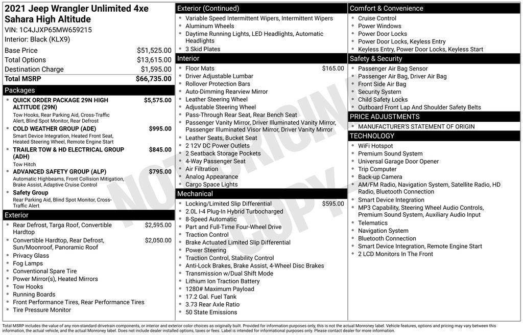 Elevate your driving experience and make a statement with this exceptional 2021 Jeep Wrangler Unlimited Sahara High Altitude 4xe. Schedule a test drive today and discover the perfect blend of capability, technology, and refinement.