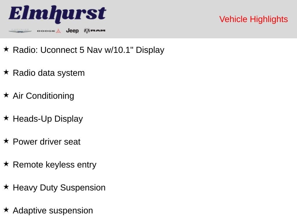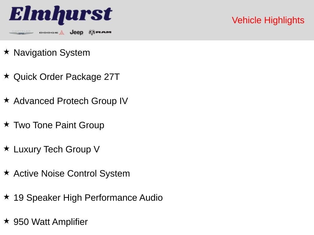 2.0L I4 DOHC, 4WD, 19 Speaker High Performance Audio, 2nd-Row Manual Window Shades, 3.70 Rear Axle Ratio, 4-Wheel Disc Brakes, 950 Watt Amplifier, ABS brakes, Active Cruise Control, Active Noise Control System, Adaptive suspension, Advanced Protech Group IV, Air Conditioning, Alloy wheels, Auto High-beam Headlights, Auto-leveling suspension, Brake assist, Compass, Deluxe Headliner, Electronic Stability Control, Front Center Armrest w/Storage, Front Passenger Interactive Display, Heads-Up Display, Heated front seats, Heavy Duty Suspension, Knee airbag, Low tire pressure warning, Luxury Tech Group V, Navigation System, Night Vision/Pedestrian-Animal Detection, Palermo Leather Door Trim, Palermo Leather Seats, Power driver seat, Power Liftgate, Quick Order Package 27T, Radio data system, Radio: Uconnect 5 Nav w/10.1 Display, Rain sensing wipers, Rear anti-roll bar, Rearview Autodim Digital Display Mirror, Remote keyless entry, Speed-Sensitive Wipers, Summit Reserve, Summit Reserve Badge, Traction control, Two Tone Paint Group, Variably intermittent wipers, Ventilated front seats, Ventilated Rear Seats, Wheels: 21 x 9 Machined Face/Painted Aluminum, Wireless Charging Pad.