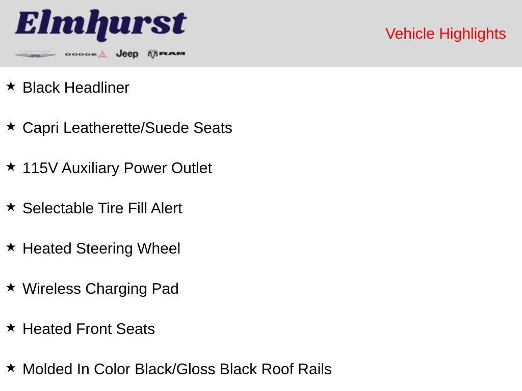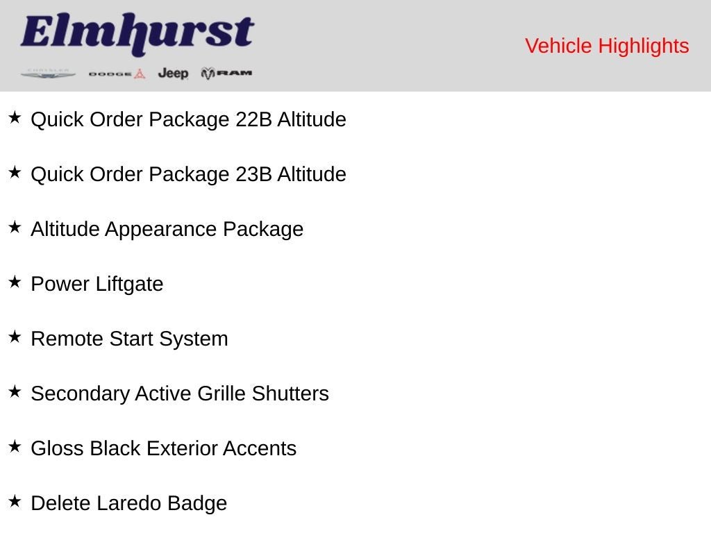 4WD, 115V Auxiliary Power Outlet, Altitude Appearance Package, Black Headliner, Capri Leatherette/Suede Seats, Delete Laredo Badge, Gloss Black Exterior Accents, Heated Front Seats, Heated Steering Wheel, Molded In Color Black/Gloss Black Roof Rails, Power Liftgate, Quick Order Package 22B Altitude, Quick Order Package 23B Altitude, Rain Sensitive Windshield Wipers, Remote Start System, Secondary Active Grille Shutters, Selectable Tire Fill Alert, Wheels: 18 x 8 Fully Painted Aluminum 1, Wireless Charging Pad.