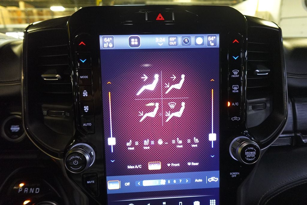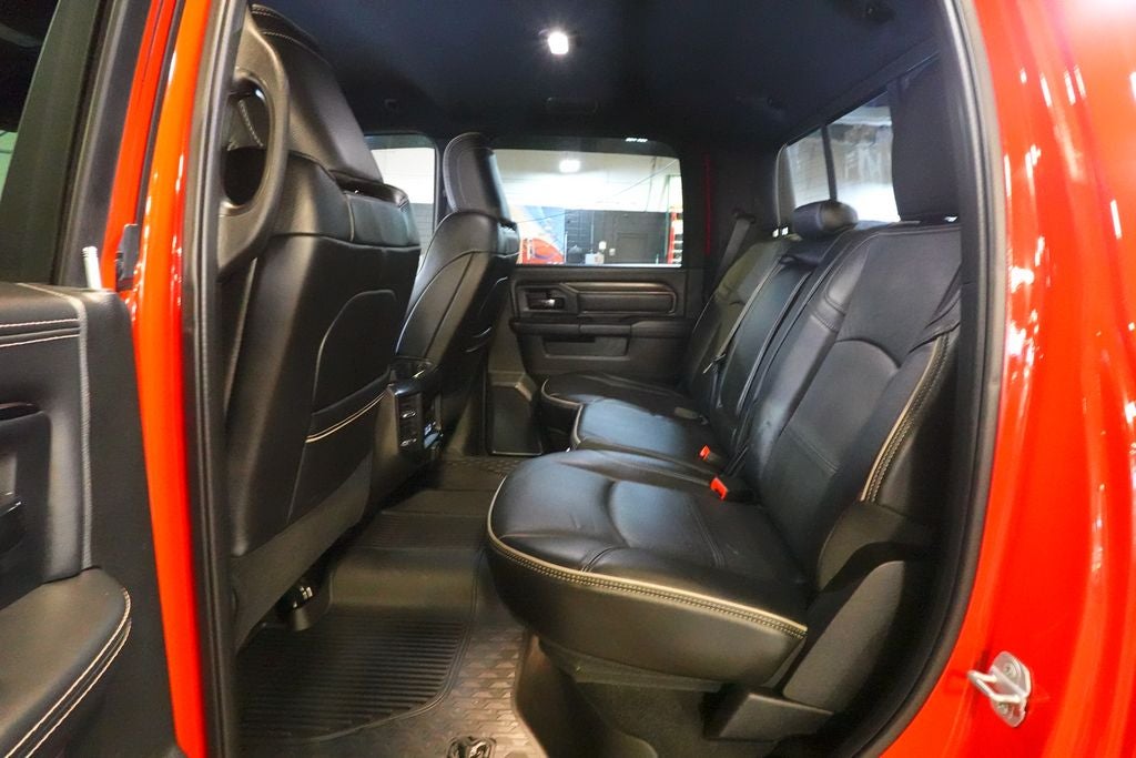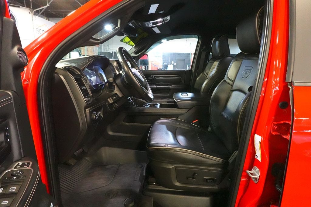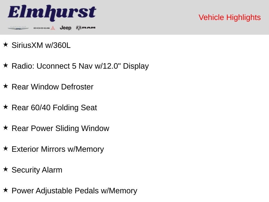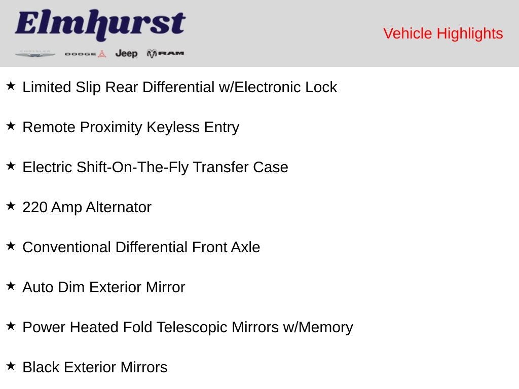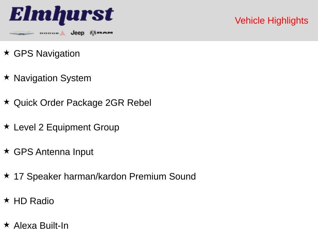 12 Touchscreen Display, 17 Speaker harman/kardon Premium Sound, 2 Way Rear Headrest Seat, 220 Amp Alternator, 4 Way Front Headrests, 40/20/40 Split Bench Seat, 4G LTE Wi-Fi Hot Spot, 4x4 Badge, Alexa Built-In, Aluminum Litho Instrument Panel Bezels w/Blk Trim, Apple CarPlay, Auto Adjust In Reverse Exterior Mirrors, Auto Dim Exterior Mirror, Auto High Beam Headlamp Control, Auto Power-Folding Mirrors, Auto-Dimming Exterior Passenger Mirror, Bi-Function LED Projector Headlamps, Black Exterior Mirrors, Black Rotary Shifter w/Silver Stripe, Black Wheel Center Hub, Body Color Door Handles, Cloth Power Bench Seat w/Emboss Tread Pattern (B9), Connected Travel & Traffic Services, Connectivity - US/Canada, Conventional Differential Front Axle, Disassociated Touchscreen Display, Electric Shift-On-The-Fly Transfer Case, Exterior Mirrors Courtesy Lamps, Exterior Mirrors w/Heating Element, Exterior Mirrors w/Memory, Exterior Mirrors w/Supplemental Signals, Folding Flat Load Floor Storage, For Details, Visit DriveUconnect.com, For More Info, Call 800-643-2112, Forward & Reverse Utility Lights, Front & Rear Floor Mats, Front Armrest w/Cupholders, Front Center Seat Cushion Storage, Front Door Accent Lighting, Global Telematics Box Module (TBM), Google Android Auto, GPS Antenna Input, GPS Navigation, HD Radio, Heated Front Seats, Heated Steering Wheel, High Back Seats, Integrated Voice Command w/Bluetooth®, Leather Wrapped Grab Handle, LED Dome Lamp w/On/Off Switch, LED Interior Lighting, Level 2 Equipment Group, Limited Slip Rear Differential w/Electronic Lock, Luxury Door Trim Panel (CTH), Manual Adjust 4-Way Front Passenger Seat, Mirror Running Lights, Navigation System, Off-Road Information Pages, Overhead LED Lamps, Painted Semi-Texture Film Instrument Panel Bezels, Power 2-Way Driver Lumbar Adjust, Power Adjust 8-Way Driver Seat, Power Adjust Mirrors, Power Adjustable Convex Aux Mirrors, Power Adjustable Pedals w/Memory, Power Heated Fold Telescopic Mirrors w/Memory, Power Telescoping Mirrors, Premium Overhead Console, Quick Order Package 2GR Rebel, Radio: Uconnect 5 Nav w/12.0 Display, Rain Sensitive Windshield Wipers, Rear 60/40 Folding Seat, Rear Door Accent Lighting, Rear Power Sliding Window, Rear Window Defroster, Remote Proximity Keyless Entry, Security Alarm, Selectable Tire Fill Alert, SiriusXM Radio Service, SiriusXM w/360L, Storage Tray, Trailer Tow Pages, Wheels: 18 x 8.0 Black Diamond Cut Aluminum.