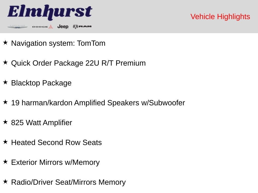 AWD, 115V Auxiliary Power Outlet, 19 harman/kardon Amplified Speakers w/Subwoofer, 7 & 4 Pin Wiring Harness, 825 Watt Amplifier, Adaptive Cruise Control w/Stop, Advanced Brake Assist, Auto-Dimming Exterior Driver Mirror, Black Roof Rails, Blacktop Package, Blind Spot w/Trailer Detection, Bright Cargo Area Scuff Pads, Class IV Receiver Hitch, Dual Remote USB Port - Charge Only, Exterior Mirrors w/Heating Element, Exterior Mirrors w/Memory, Exterior Mirrors w/Supplemental Signals, Floor Console w/Leather Armrest, Forged Carbon Fiber Interior Accents, Full Speed Forward Collision Warning Plus, Gloss Black Badges, Gloss Black Exterior Mirrors, Heated Second Row Seats, Integrated Roof Rail Crossbars, Lane Departure Warning Plus, Leather Trimmed Bucket Seats, Leather Wrapped Door Panels, LED Auxiliary Low Beam & Turn Signal, Navigation system: TomTom, Power 6x9 Multi-Function Foldaway Mirrors, Power 8-Way Driver Memory 8-Way Passenger Seats, Power Sunroof, Power Tilt & Telescopic Steering Column, Premium Instrument Panel, Quick Order Package 22U R/T Premium, Radio/Driver Seat/Mirrors Memory, Red Accent Stitching, Satin Black Dodge Tail Lamp Badge, Suede Headliner, Trailer Brake Control, Ventilated Front Seats.